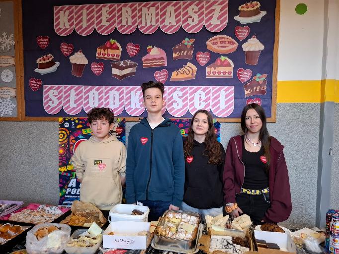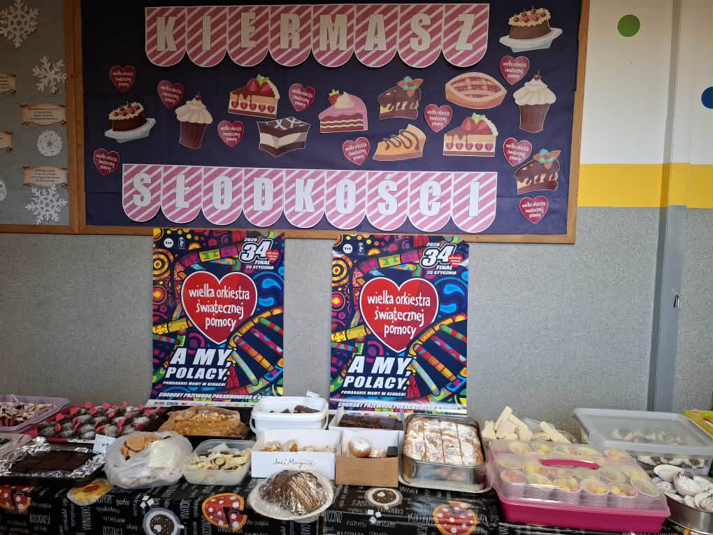 21 stycznia Samorząd Uczniowski zorganizował w szkole podczas przerw między lekcjami kiermasz słodkości. Była to akcja na rzecz Wielkiej Orkiestry Świątecznej Pomocy, której celem w tym roku jest wsparcie diagnostyki i leczenia chorób przewodu pokarmowego u dzieci. Samorząd Uczniowski zgłosił akcję do wybranego Sztabu w Łodzi, w wyniku czego szkoła uzyskała specjalną puszkę WOŚP, plakaty oraz naklejki serduszka. Następnie uczniowie z Samorządu Uczniowskiego zrobili piękne stoisko z dekoracjami ciast i babeczek oraz przygotowali do sprzedaży wypieki przyniesione przez uczniów i rodziców naszej szkoły.