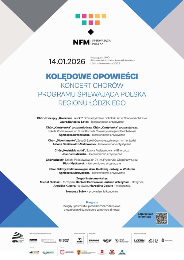 14-15 stycznia 2026, godz. 18:00 w Filharmonii Łódzkiej odbędzie się koncert chórów szkolnych w ramach projektu ,,Śpiewająca Polska" w którym wystąpi chór Szkoły Podstawowej nr 94 im. Fryderyka Chopina pod batutą pana Piotra Mytkowskiego.