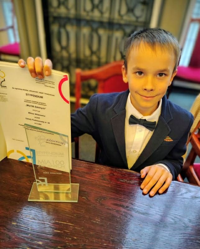 Miłosz Wilanowicz uczeń klasy 2b decyzją Prezydenta Miasta Łodzi został stypendystą w ramach Miejskiego Systemu Wspierania Uczniów Uzdolnionych „Mia100 Zdolnych”.